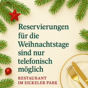 unser gemütliches Restaurant & Café im Eickeler Park ist in den Wintermonaten von Dienstag bis Samstag von 12:00 – 23:00 Uhr und am Sonntag von 10:30 – 23:00 Uhr für Sie geöffnet.